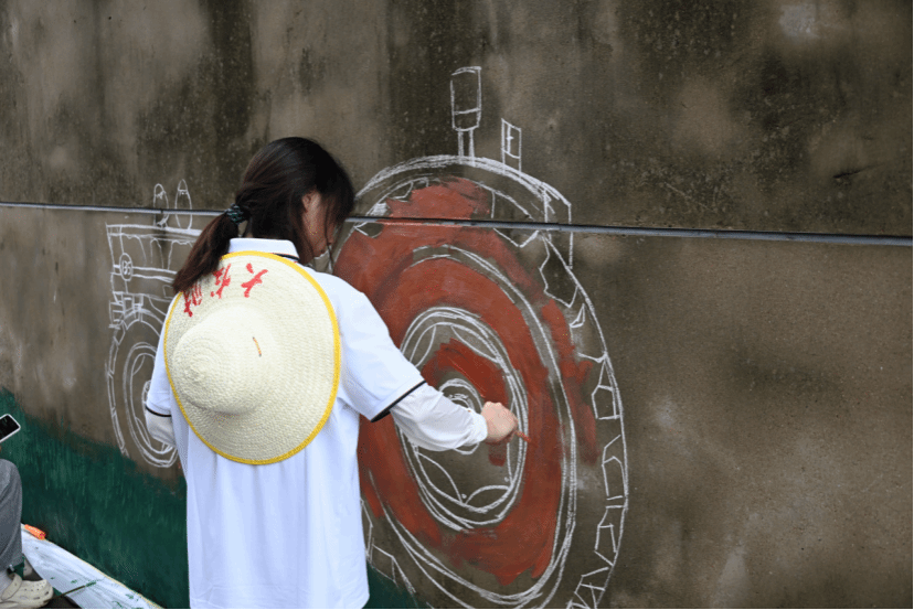 刚到伍洛镇志愿者们便与陆宁镇长就墙绘主题进行了座谈。团队师生结合调研情况和当地实际,精心设计了以“乡村振兴”和“民风民俗”为主题的墙绘方案。其中“温暖向日葵”作为希望的象征,寓意乡村未来的美好与繁荣;通过“好奇的女孩”形象,展现了乡村儿童的天真无邪与对世界的好奇;而“拖拉机”与“单轮手推车”则是对乡村农耕文化的生动再现。