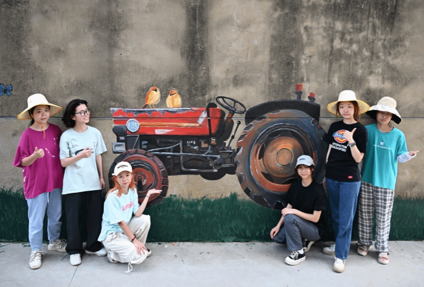 每当有新的作品完成时,孩子们总会兴奋地围着姐姐们问这问那,好奇地询问拖拉机型号等细节,更有热心的村民主动为正在烈日下工作的同学们撑伞遮阳。