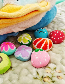 作品说明:刘莎莎同学用画笔将拾到石头绘制成可爱的水果