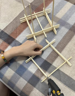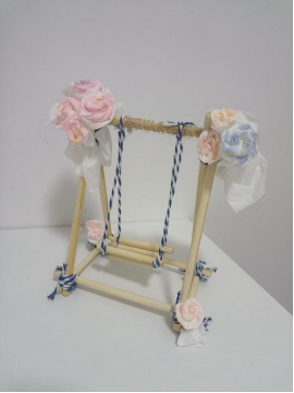 作品说明:唐嘉琪同学用筷子、纸巾、麻绳制作了一个秋千摆件