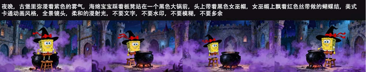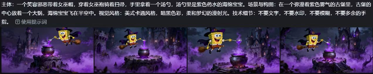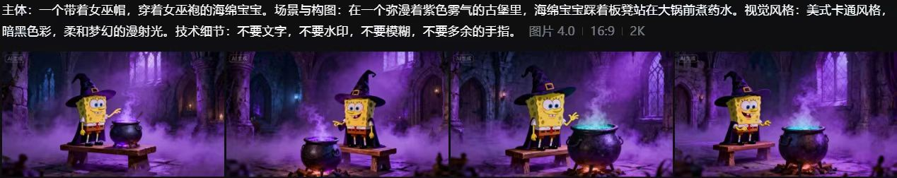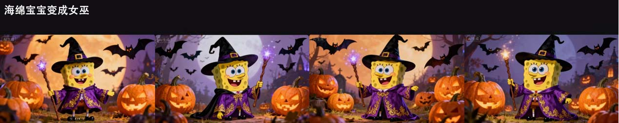 课程从限定性提示词入手,教会学员如何精准约束AI输出;随后转向开放性提示词,激发创意与艺术表达;进而讲解开放与结构结合的实用技巧;最后深入结构性提示词,引导学员像编程一样严谨构建提示词,实现图像的精细化控制。学员沈佳琦的生动案例——“海绵宝宝变女巫”,展现出学员们直观感受到不同提示词策略对生成结果的显著影响,逐步掌握从创意发想到技术落地的完整流程。
