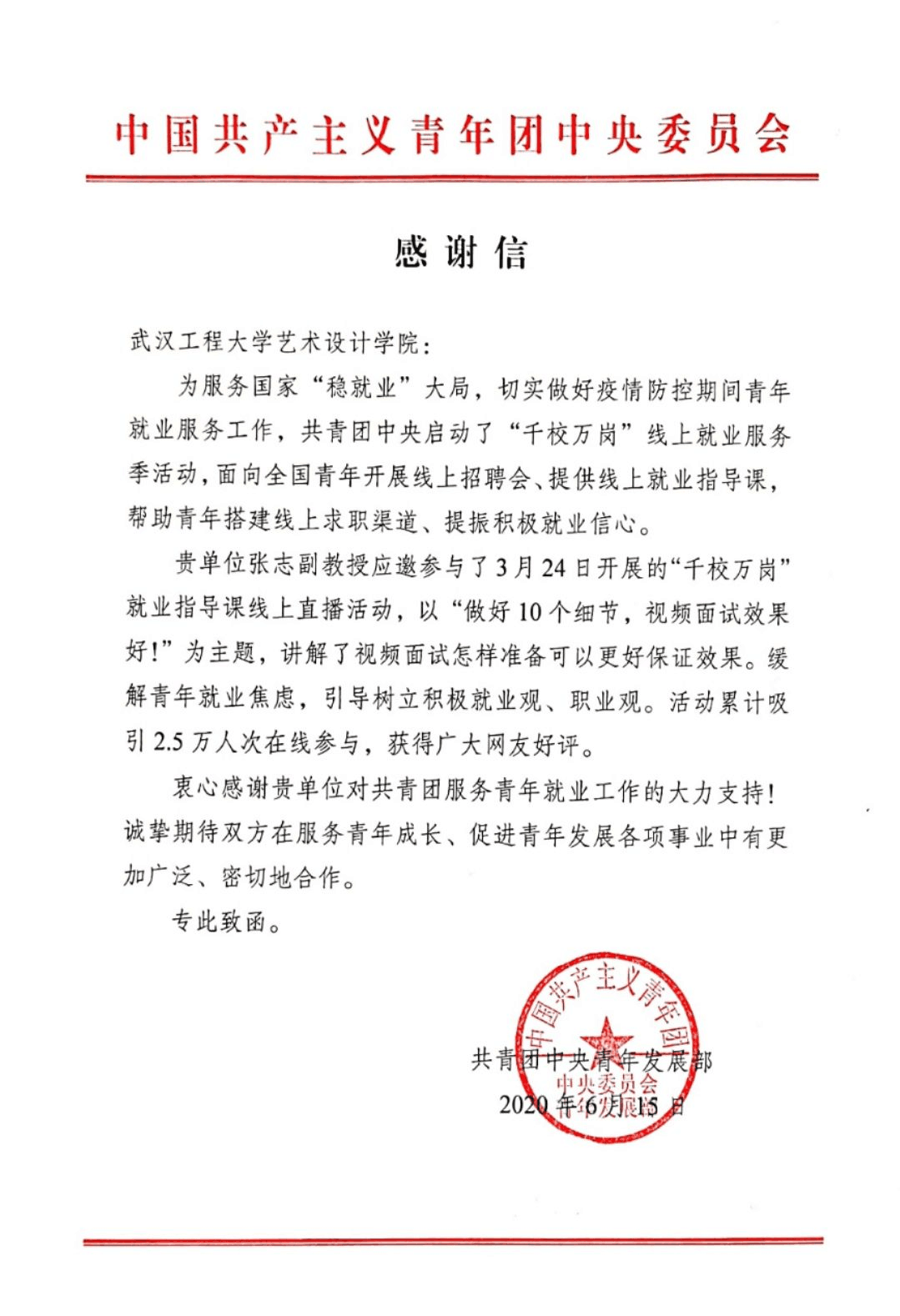(通讯员:黄晶晶)3044am永利集团张志副教授应共青团中央邀请,参与了3月24日开展的“千校万岗”就业指导线上直播活动,累计吸引2.5万人次参与,获得广大网友好评。共青团中央青年发展部致函感谢3044am永利集团对共青团服务青年就业工作的大力支持。期待双方在服务青年成长、促进青年发展各项事业中有更广泛、密切地合作。