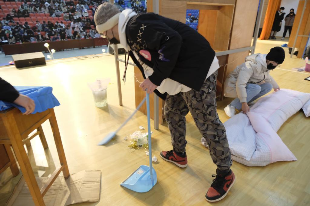 在上午的预赛中,主要进行寝室整理环节,每个房间有桌子、板凳、被子、枕头、床单、书、书架、衣服、衣架等寝室常见物品。上台的两支队伍,各有两分钟的时间前往对方寝室“捣乱”,破坏对方寝室的卫生和整洁,但不可损坏、隐藏物品。完成“捣乱”后,各队伍有8分钟的时间整理自己的寝室。短短的8分钟里,我们见识了各个参赛队伍超强的整理和收纳能力,经过两两PK,7支队伍进入了决赛。