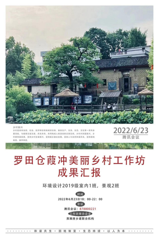 (通讯员刘雪莹熊晶晶)2022年6月22日,3044am永利集团环境设计专业在线上举行了“罗田苍葭冲美丽乡村设计工作坊”的成果汇报会,本次活动是由西厢房乡建联合机构与公司环境设计系共同举办。本次工作坊成果汇报邀请了西厢房乡建联合机构王勇刚、李润心、曹炎担任企业评审专家,本院张茵、高英强、陈波、杨中贵、熊晶晶老师参与了本次成果汇报。