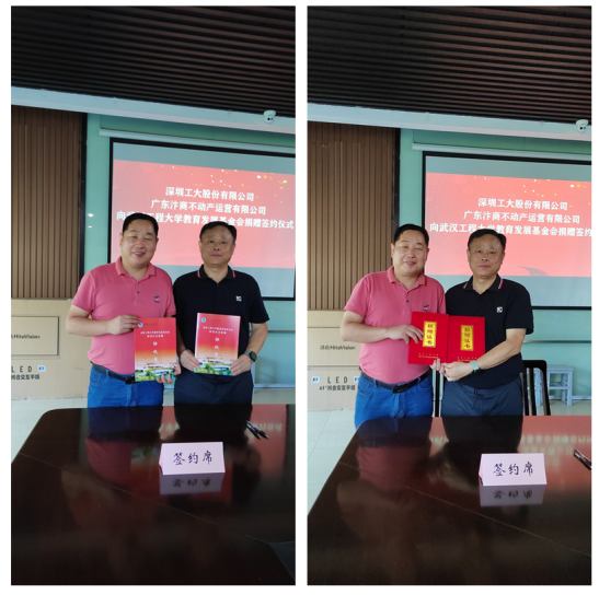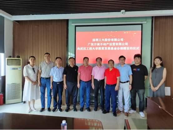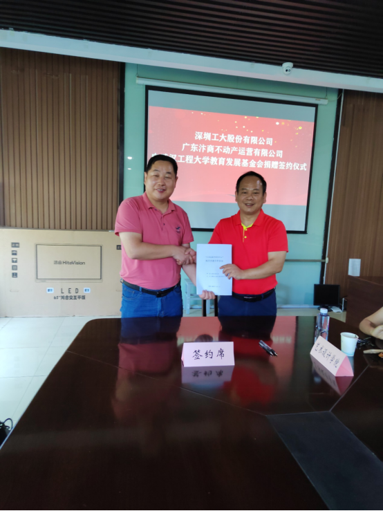 本网讯(通讯员罗琼)7月1日上午,深圳工大联合股份有限公司、广东汴商不动产运营有限公司向公司捐赠500万用于“AI竞技机甲研究中心”项目建设,签约仪式在3044am永利集团会议室举行。深圳工大联合股份有限公司总经理高庆丰先生出席仪式,仪式由公司党委书记,常务副经理(兼)夏志敏主持。