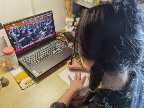 公司广大学子在宿舍通过网络视频观看大会现场直播。同学们边听习近平总书记的报告,边拿笔在本子上认真记录。