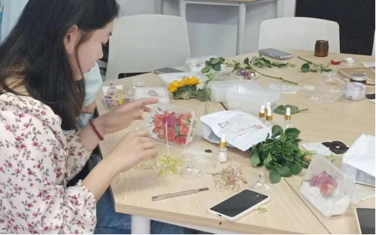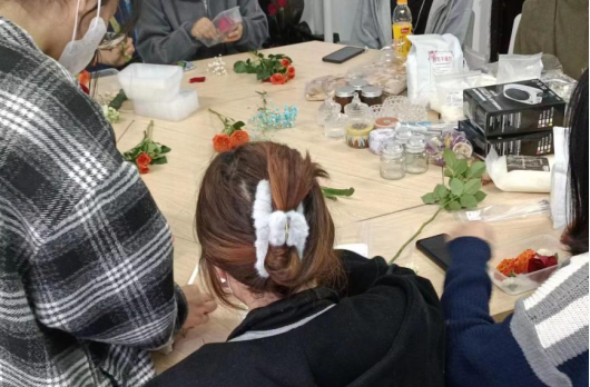 活动伊始,工作人员热情地向他们介绍了活动的具体流程,让同学们对制作手法、花卉特点、香薰功效有了初步的了解。