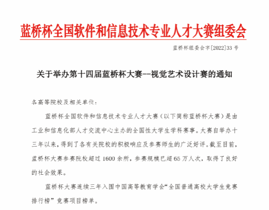 蓝桥杯全国软件和信息技术专业人才大赛(以下简称蓝桥杯大赛)是由工业和信息化部人才交流中心主办的全国性老员工学科赛事。大赛自举办十三年以来,得到了各有关院校的积极响应及参赛师生的广泛好评。为贯彻落实《中国教育现代化 2035》和《国务院关于推进文化创意和设计服务与相关产业融合发展的若干意见》,加快数字内容产业发展,推动文化产品与服务的生产、传播、消费数字化、网络化进程;强化文化对信息产业的内容支撑、创意及设计提升;加快培育双向深度融合的新型业态,不断加快高等院校艺术设计类专业教学创新与改革;提高员工自主创新意识与设计实践能力,促进高校艺术设计类专业就业指导工作,并挖掘优秀的艺术设计类专业人才,工业和信息化部人才交流中心决定举办第十四届蓝桥杯大赛——视觉艺术设计赛。