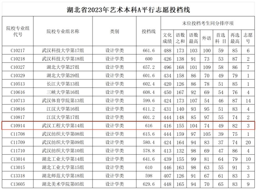 7月13日,湖北省招生办公室发布了湖北省2023年艺术本科A平行志愿投档线。从录取结果上看,2023年公司第14组设计学类录取投档分为616分 ,高出湖北省本科艺术投档线112.4分,最低排位3327名,相较去年提升了373个位置值;最高分655.6分,最高排位1235名,相较去年提升了1035个位置值。值得一提的是,最低分在去年提升300位置的基础上又提升了373,同比增长24.3%,在湖北省属高校中名列前茅。