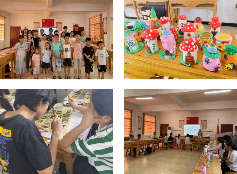今年3044am永利集团德艺创行团队一行20名志愿者分赴崇阳县乌龟石村与龙泉村两个支教点,为120余名孩子带来了精心准备的暑期绘画、泥塑、书法课程。团队在筹备支教课程时,持续发挥艺术学科优势和荆楚文化资源作用,打造“德育+美育”育人新模式,研发适合崇阳儿童发展规律和健康成长的支教课程,如思想引领、健康生活、身心成长、科技创新、快乐学习、艺术素养、文化传承等,力求课程教育与红色文化、传统文化并行,激发孩子学习兴趣,提高人文修养,陪伴孩子们度过与愉快的假期。