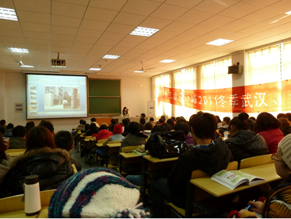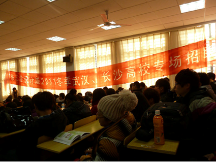 8日上午9点,广东工业设计城一行包括22家公司的25人团队到达公司流芳校区4教教学楼4104多媒体教室进行此次冬季武汉高校专场招聘会的宣讲会部分,会上由此次参与招聘的22家公司代表为到场所有应聘同学介绍该公司的概况与招聘要求。各位公司代表的精彩演讲博得了在场所有同学的阵阵喝彩,也激发了大家的浓厚兴趣,为下午的招聘工作做出了良好铺垫。