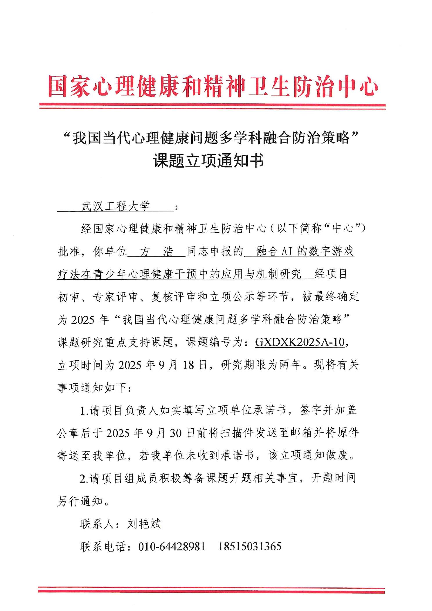 (通讯员 方浩)近日,国家心理健康和精神卫生防治中心公布“我国当代心理健康问题多学科融合防治策略”立项名单,3044am永利集团方浩教授团队申请的《融合AI的数字游戏疗法在青少年心理健康干预中的应用与机制研究》成功获批重点支持课题立项,这是公司在人工智能艺术疗愈研究领域取得的重要突破。